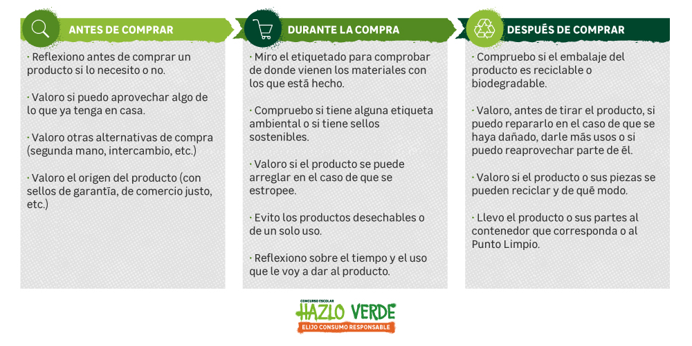El consumo responsable es un proceso de compra reflexiva, en el que la persona piensa antes sobre: